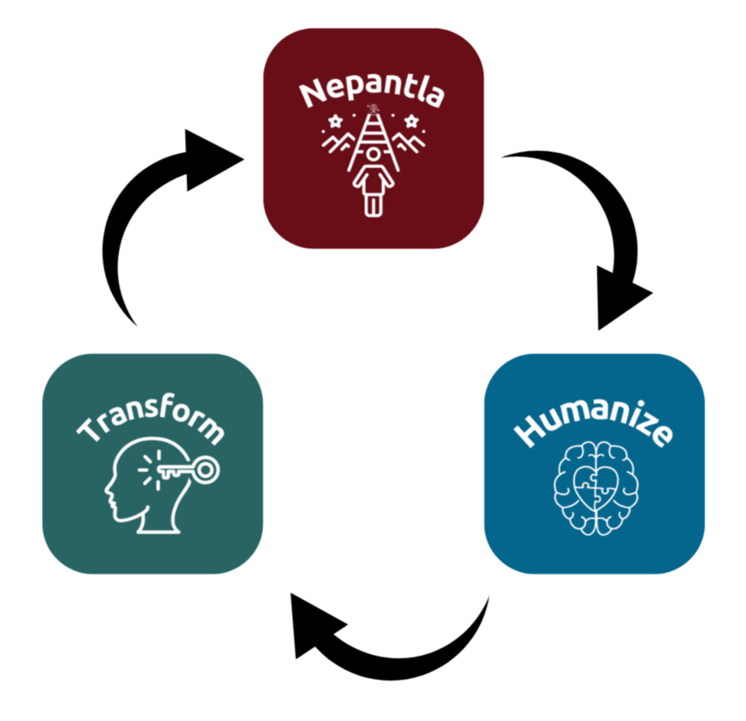 A Nahuatl (“Aztec” language) term connoting in between or a reference to the space of the middle. In other words, it is the space of uncertainty, tension between truths, and "grey area". We assert that growing in nepantla helps us form critical perspectives to better prepare our students.