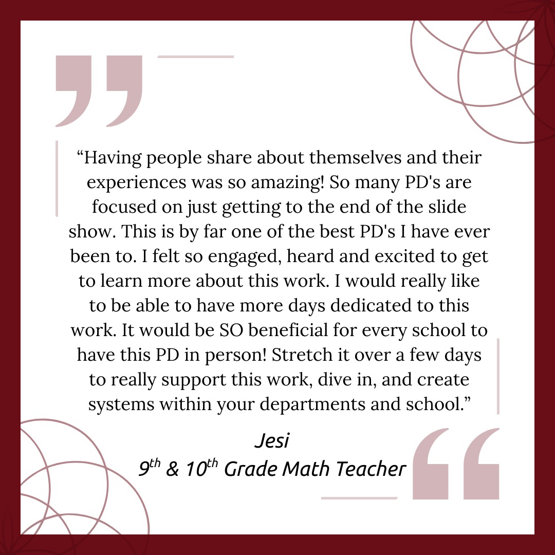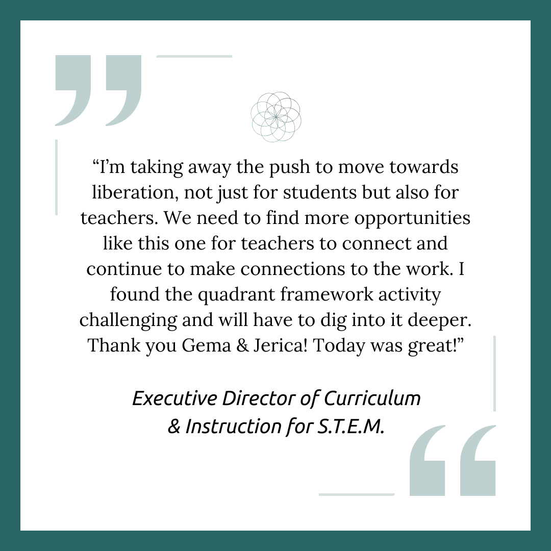 Through our cyclic cohorts and coaching model spread out over the year, we support educators and leaders in deepening practice, strengthening leadership capacity, and implementing humanizing S.T.E.M. approaches with confidence over time.RECOMMENDED FOR