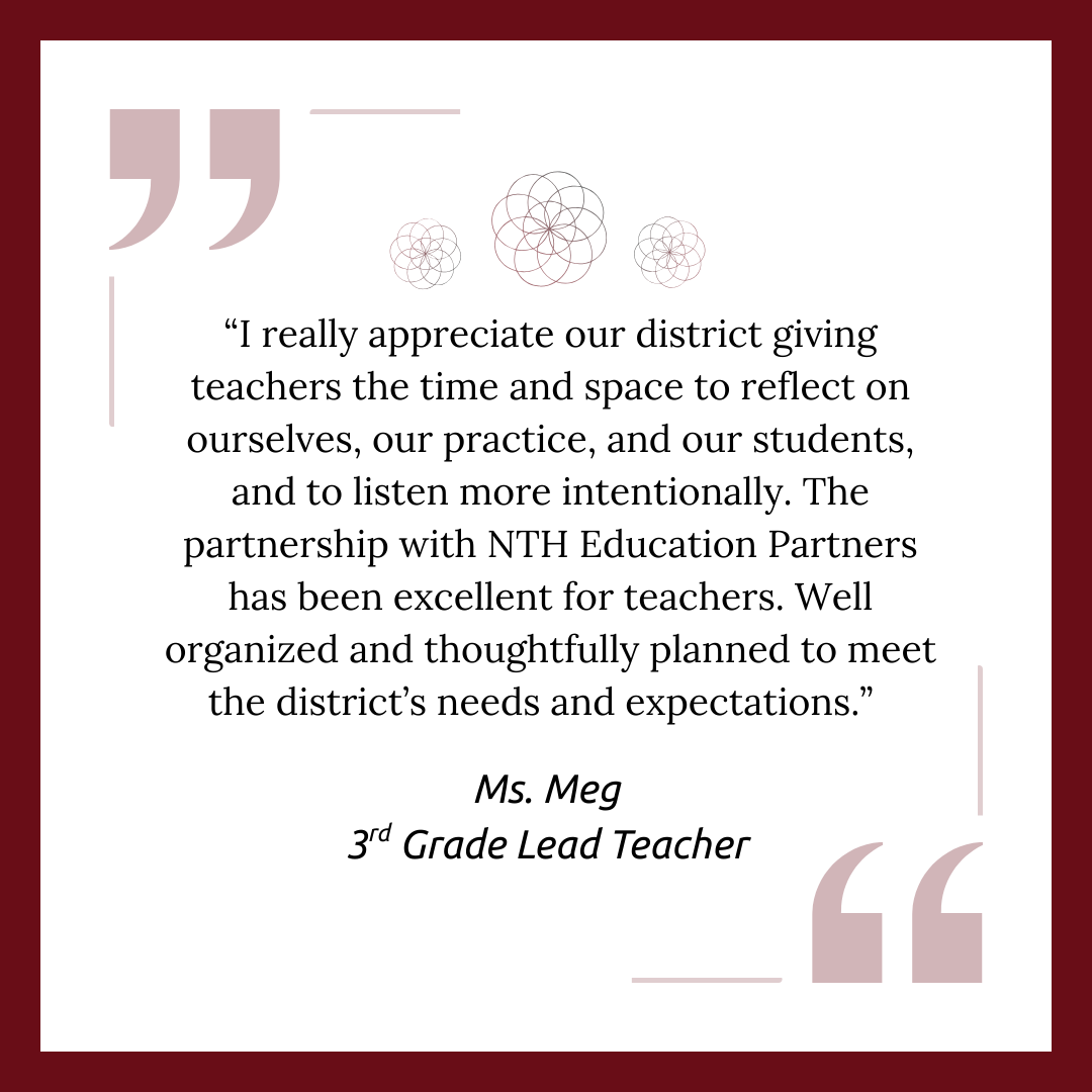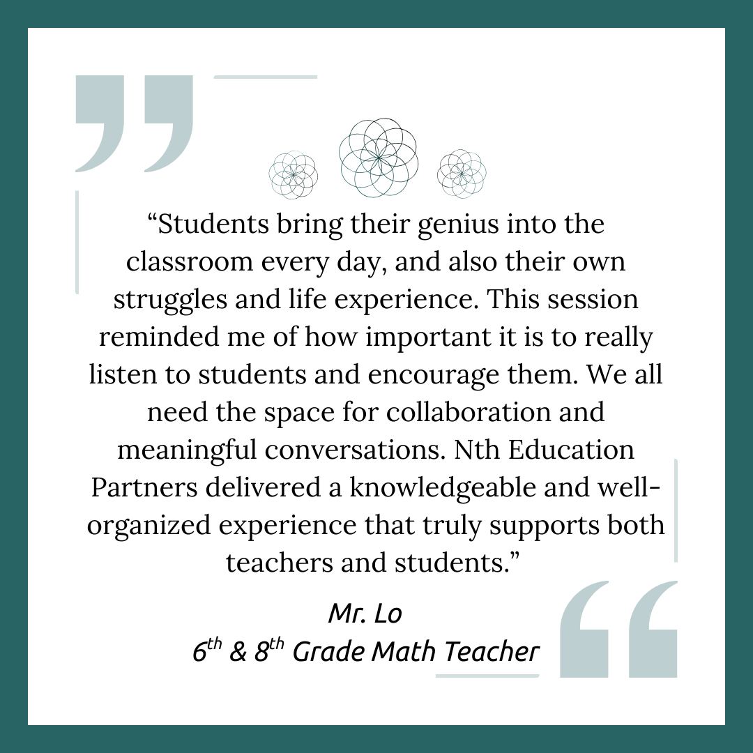 At Nth Education Partners, we build transformative partnerships with districts, schools, and their communities to advance high-quality, humanizing S.T.E.M. education. Our work is grounded in Nth’s original frameworks and models, developed by former and current mathematics educators’ research and shaped by lived classroom experience.